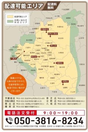 現在は八尾市の店舗よりお届けを行っており、エリアやご注文内容に応じて、その都度お届けの可否を検討させていただく形とはなりますが、