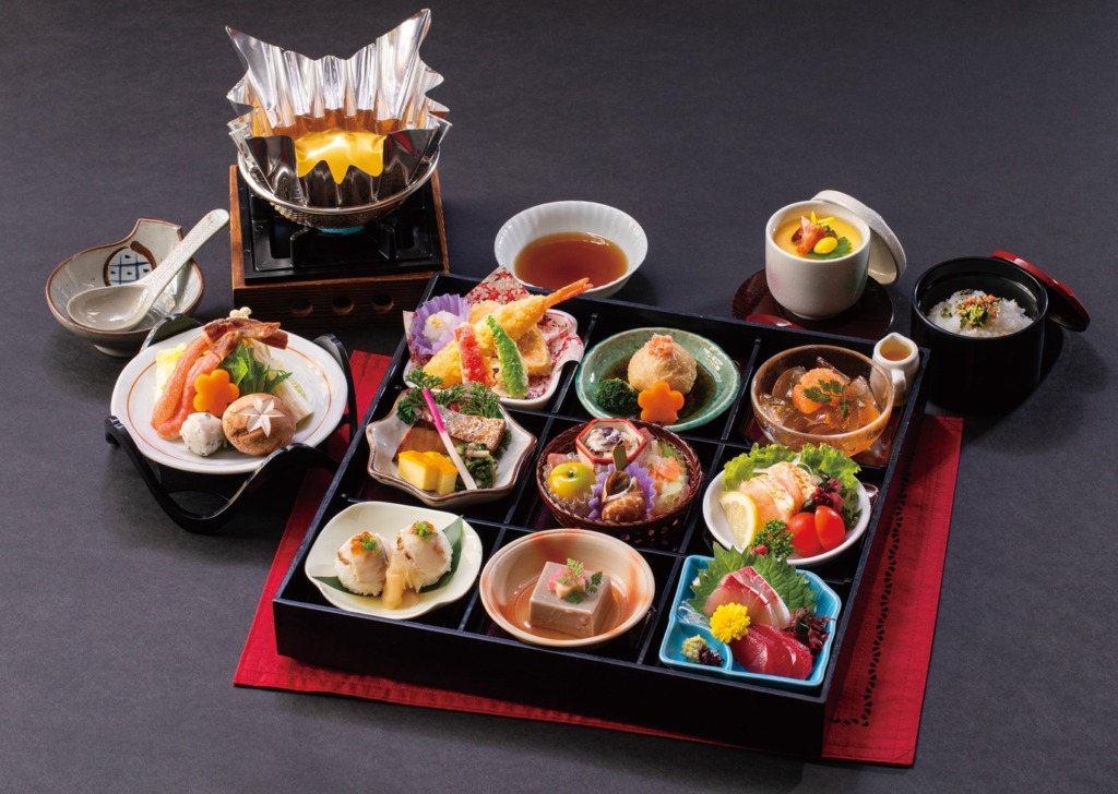 ずわいがに鍋、自家製ぶりの幽庵焼き、ふっくらかにあんかけ、オレンジシロップの自家製寒天ゼリー等、冬の旬の味覚を盛り込んだ松花堂弁当です。