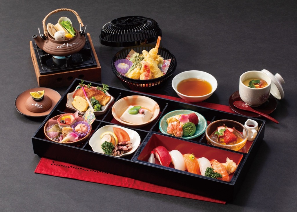 赤魚の幽庵焼き、春野菜の天ぷら、いちごの古都華を使用した寒天ゼリー、はまぐりの土瓶蒸し等、春の旬を盛り込んだ松花堂弁当です。